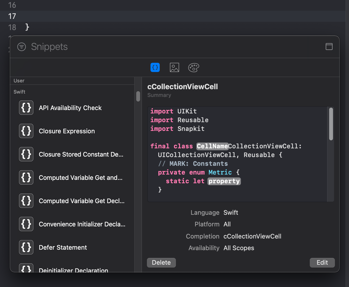 [iOS - swift] Xcode에서 커스텀 자동 완성 만드는 방법, 관리 방법 (Code Snippet) 본문