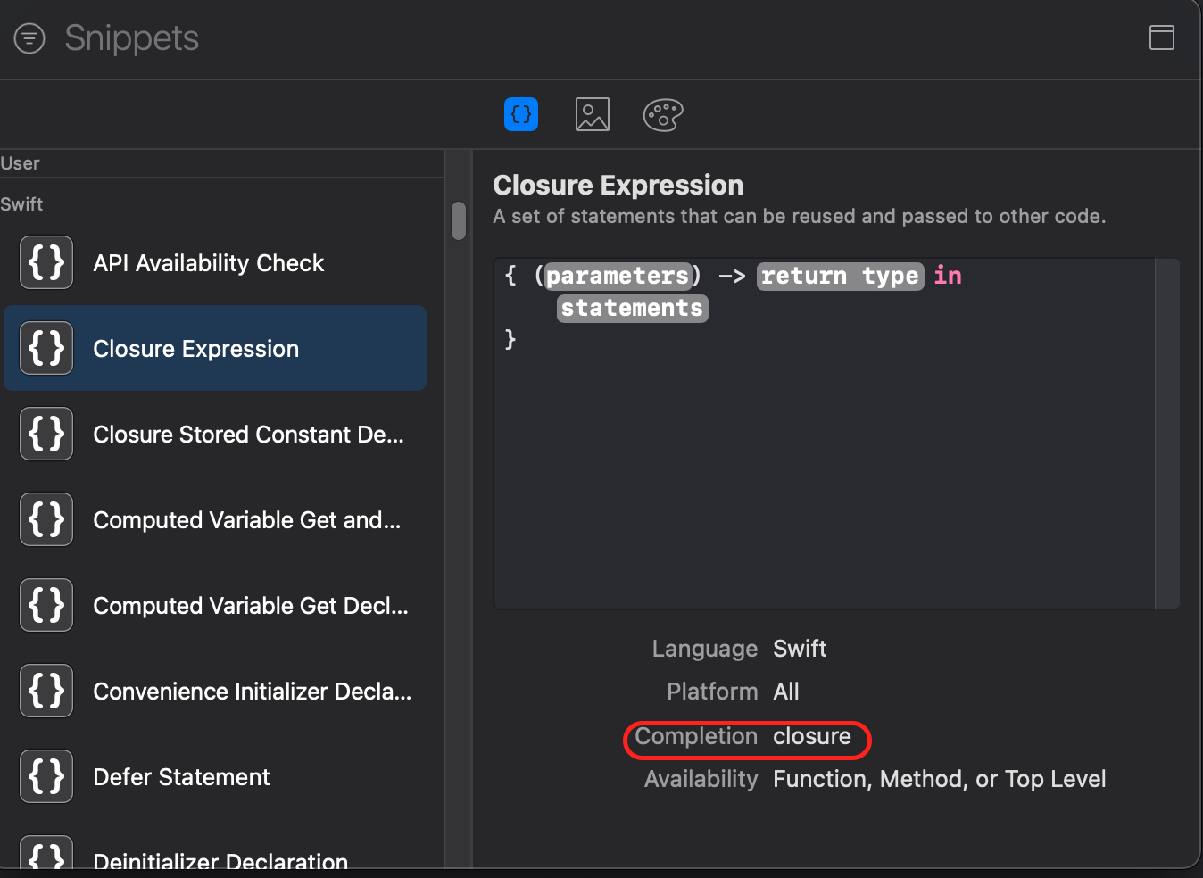 - ex) Closure Expression 코드 스니펫 사용하기