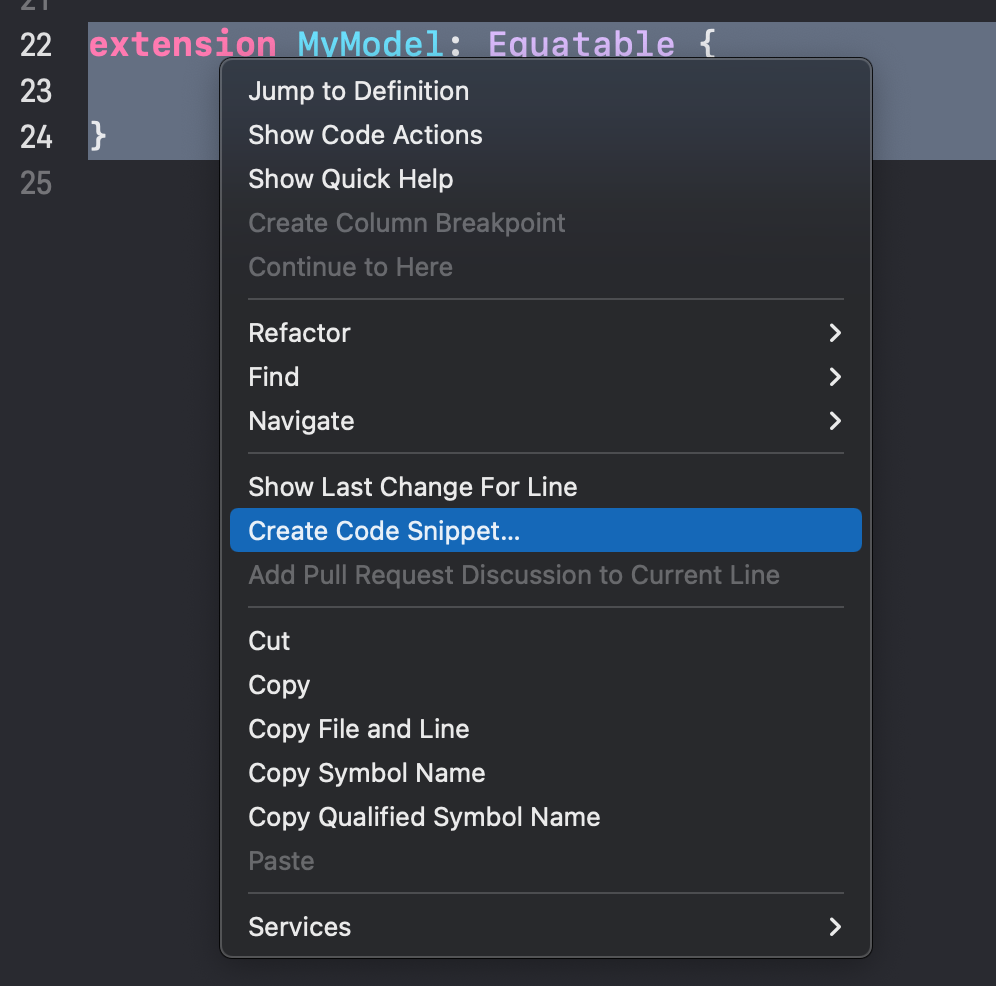 - 스니펫을 만드려는 코드에 block을 칠한 후 오른쪽 마우스 클릭 -> Create Code Snippet 선택