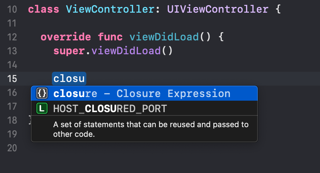 - Completion에 "closure"로 되어있으므로 자동 완성 사용 시 closure로 사용