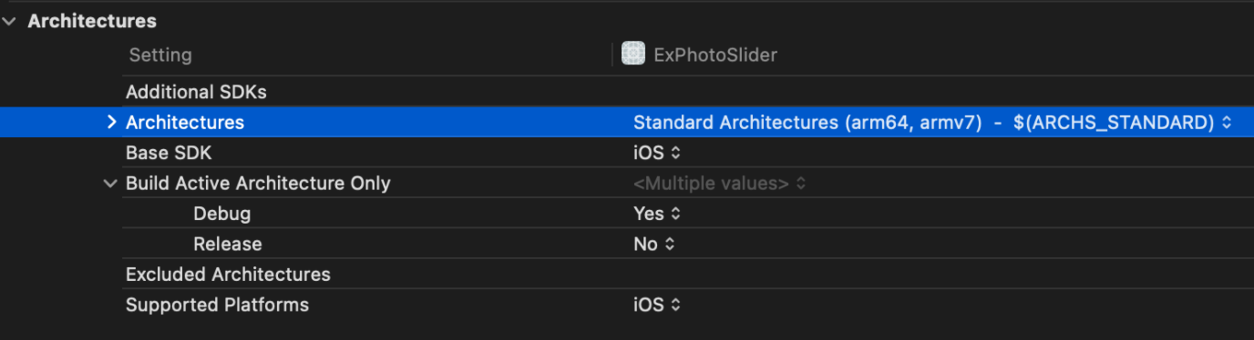 - Build Active Architecture Only의 값을 Yes로 할 경우, 현재 연결된 기기를 감지해 그 기기에 맞는 아키텍쳐용 빌드만 생성