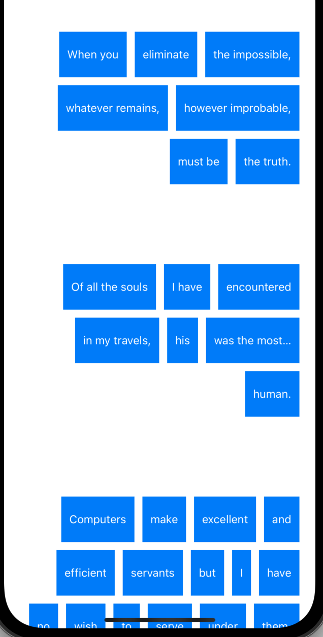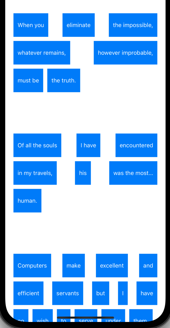 import UIKit import Reusable import SnapKit import Then final class CollectionViewCell: UICollectionViewCell, Reusable { // MARK: UI let label = UILabel().then { $0.font = .systemFont(ofSize: 14) $0.textColor = .white $0.backgroundColor = .systemBlue $0.textAlignment = .center } // MARK: Initializers override init(frame: CGRect) { super.init(frame: frame) self.contentView.backgroundColor = .systemBlue self.contentView.addSubview(label) self.label.snp.makeConstraints { $0.left.right.equalToSuperview().inset(10) $0.top.bottom.equalToSuperview().inset(20) } } @available(*, unavailable) required init?(coder aDecoder: NSCoder) { fatalError("init(coder:) has not been implemented") } } - CollectionView 사용 - collectionViewLayout 부분에 AlignedCollectionViewFlowLayout 인스턴스를 주입