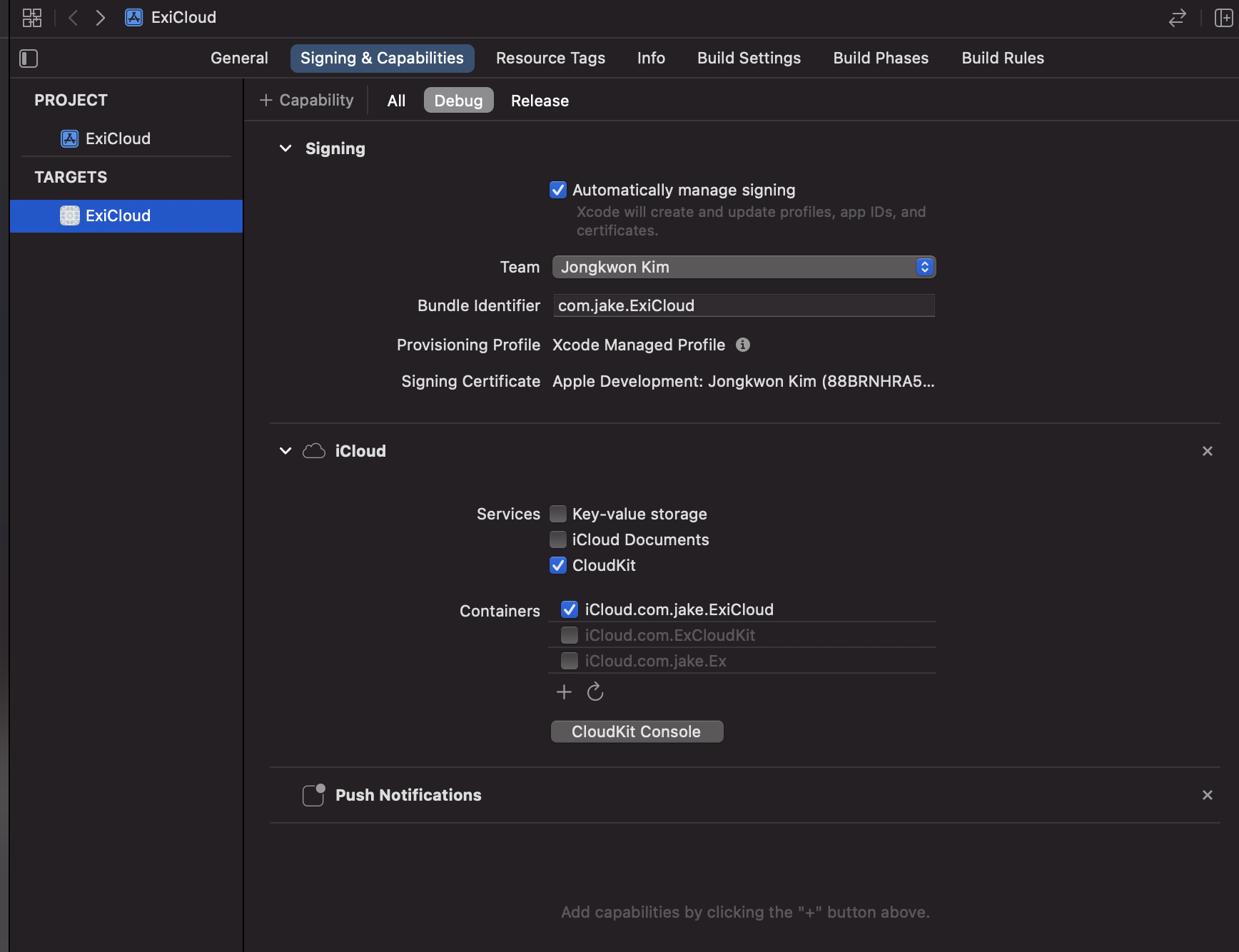 - iCloud를 사용하려면 내부적으로 Push Notifications 필수로 사용