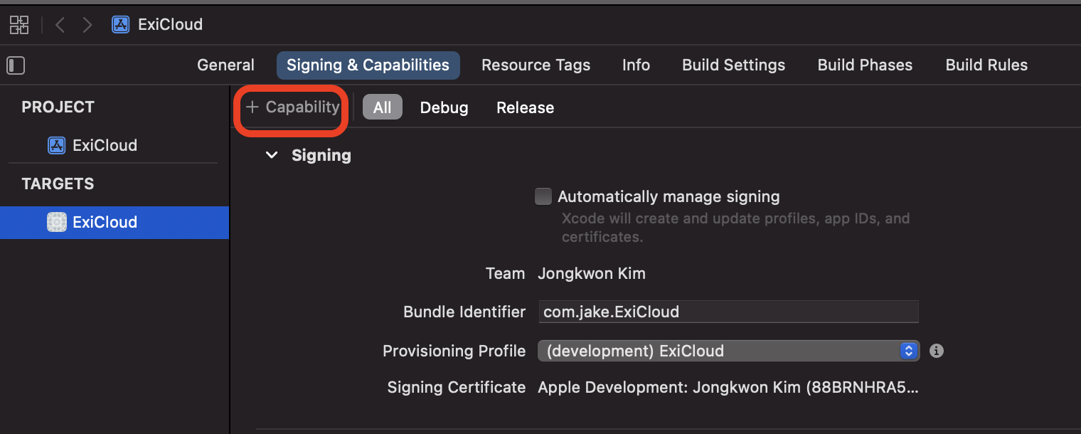- Targets > Signing & Capabilities > Automatically manage signing 해제 후 다운받은 profile를 import