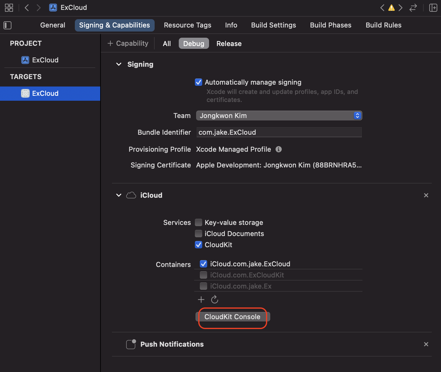 * 주의: iCloud, CloudKit 사용 방법 - Xcode, Profiles 세팅의 예제 코드에서 Bundle Identifier가 com.jake.ExiCloud에이었지만, 아래부터 com.jake.ExiCloud으로 변경