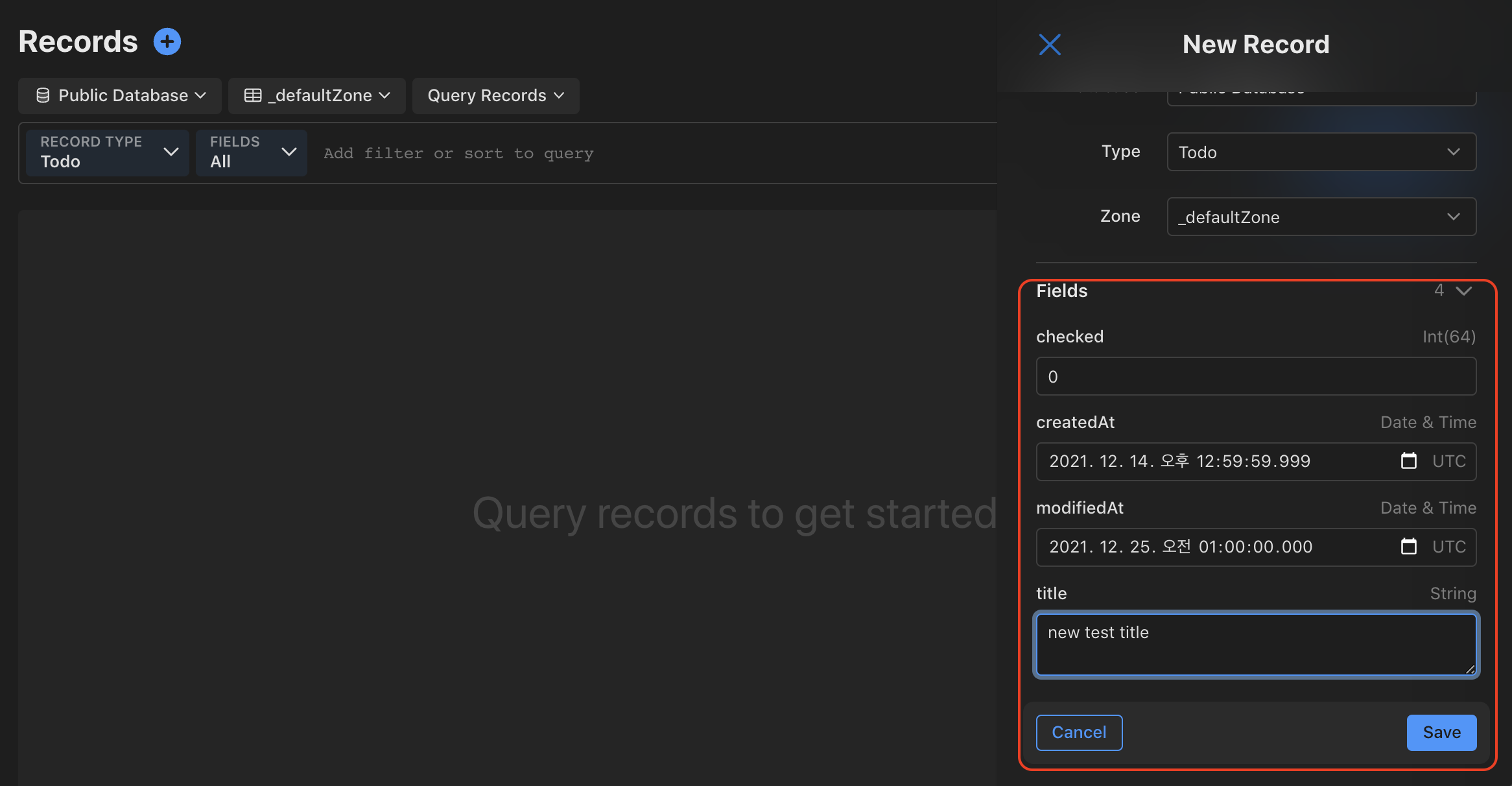 - Test 데이터 생성 - Records 탭 -> + 버튼 클릭 -> Create New Record 선택