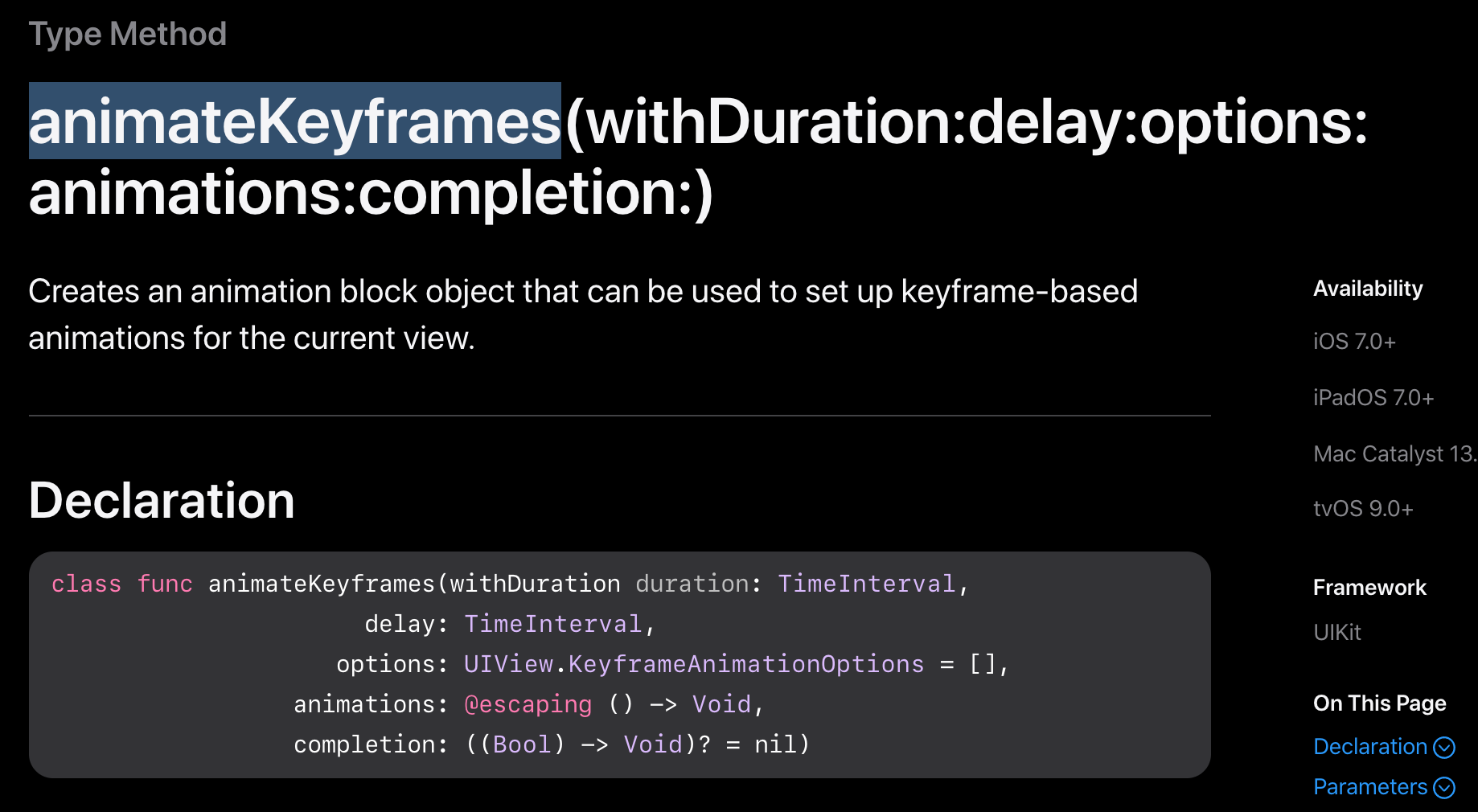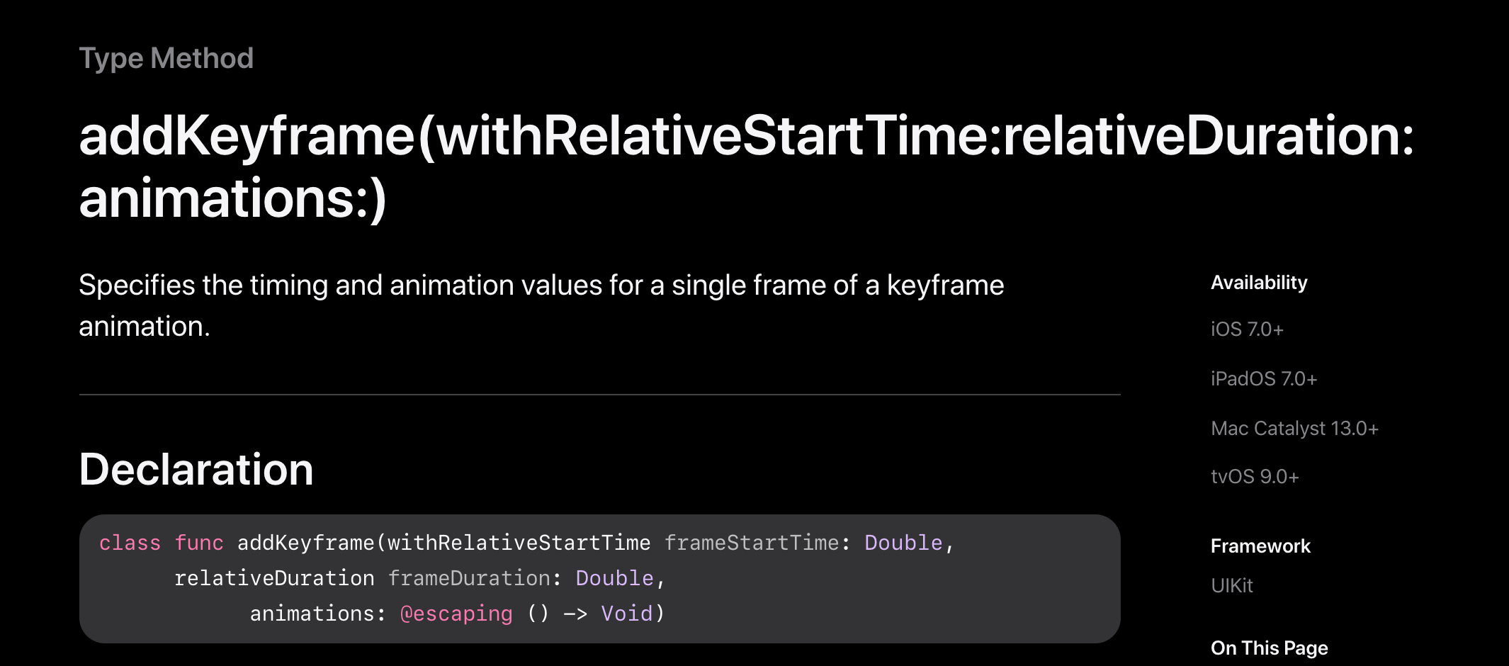 - addKeyframe: https://developer.apple.com/documentation/uikit/uiview/1622554-addkeyframe
