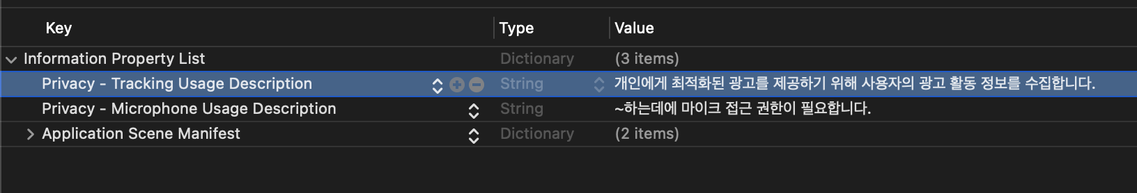 - info.plist 설정: Privacy - Tracking Usage Description