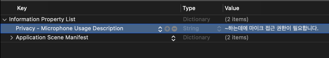 - info.plist에서 설정: Privacy - Microphone Usage Description
