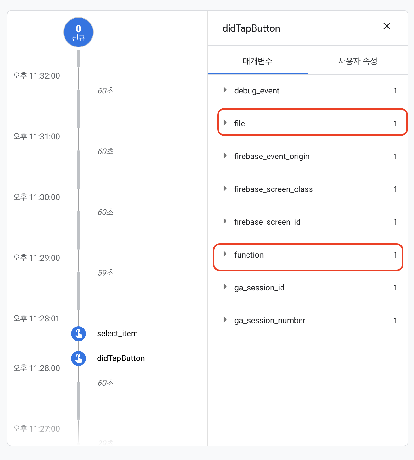 // 직접 정의한 파라미터 @IBAction func didTapButton(_ sender: Any) { let event = "didTapButton" let parameters = [ "file": #file, "function": #function ] Analytics.logEvent(event, parameters: parameters) }