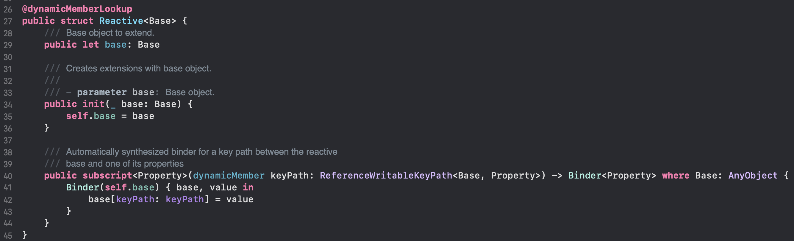 public subscript<Property>(dynamicMember keyPath: ReferenceWritableKeyPath<Base, Property>) -> Binder<Property> where Base: AnyObject {