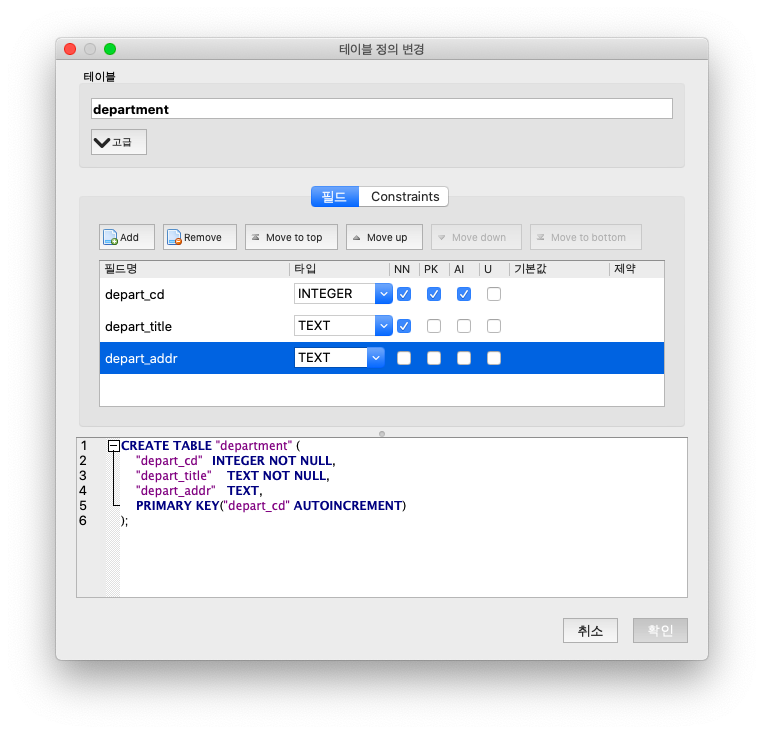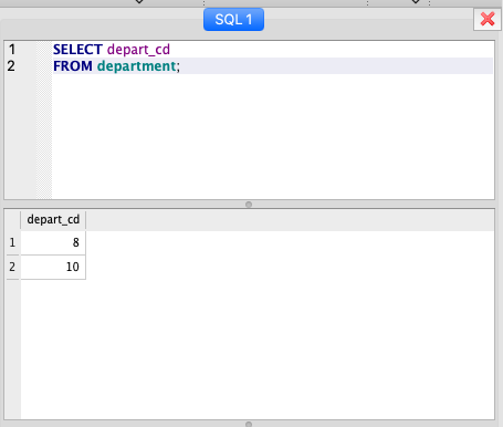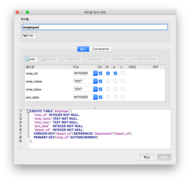 2) 두 번째 테이블을 정의한 후 외래키를 department의 depart_cd로 설정