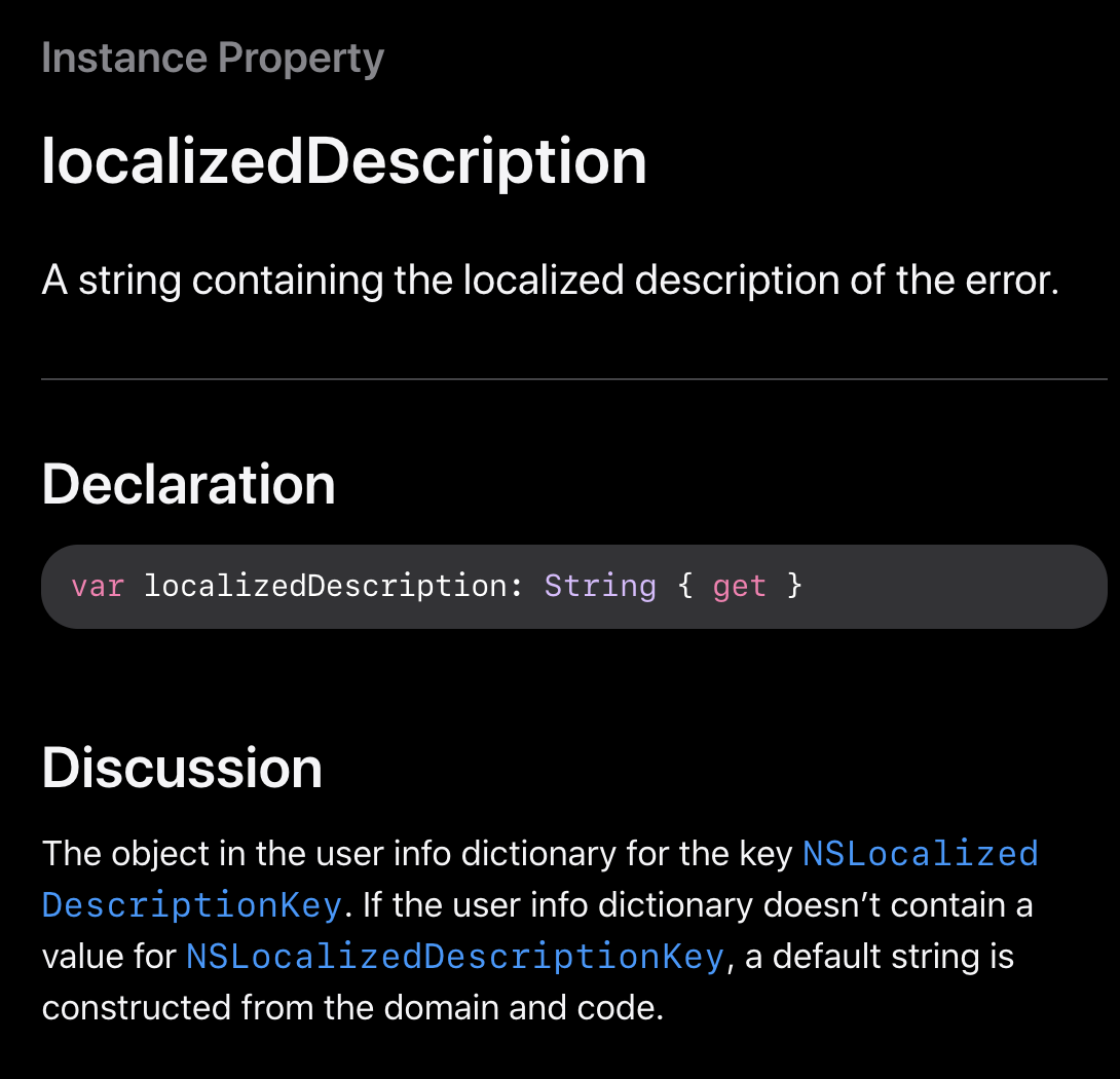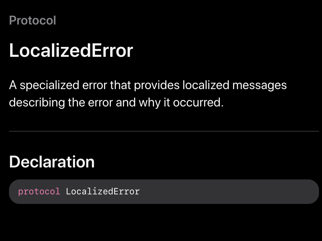 - 해당 프로토콜을 준수하고, computed property인 `public var errorDescription: String?`를 정의하면, 사용하는쪽에서 .localiedDescription사용이 가능