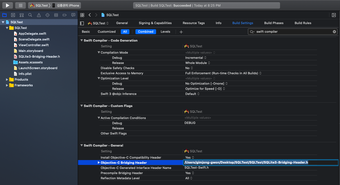 -> swift Compiler - General -> Objective-C Bridging Header에 아까 추가한 파일의 디렉토리명 복붙