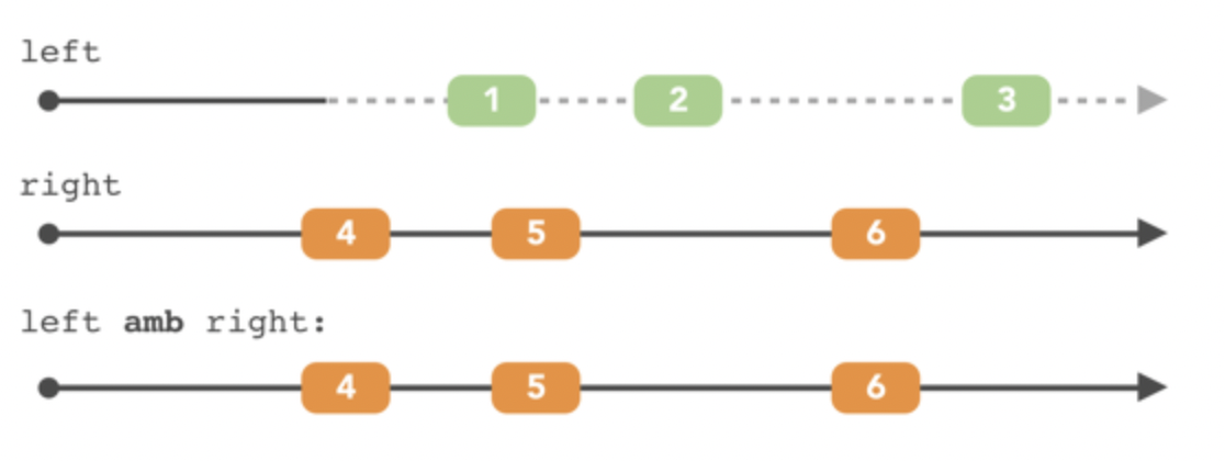 - let newObservable = left.amb(right) => left 스트림과 right 스트림 중 먼저 방출되는 스트림만 살아남고 나머지 하나는 무시