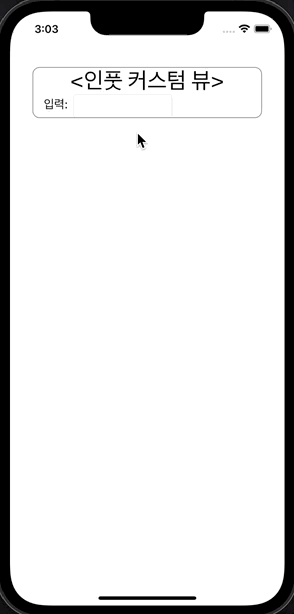 // MyCustomView.swift import UIKit import SnapKit import Then final class MyCustomView: UIView { private let titleLabel = UILabel().then { $0.textColor = .black $0.text = "<인풋 커스텀 뷰>" $0.font = .systemFont(ofSize: 32) $0.textAlignment = .center } private let inputInformationLabel = UILabel().then { $0.textColor = .black $0.text = "입력:" } private let textField = UITextField().then { $0.textColor = .black $0.borderStyle = .roundedRect } override init(frame: CGRect) { super.init(frame: .zero) self.layer.borderWidth = 1 self.layer.borderColor = UIColor.gray.cgColor self.layer.cornerRadius = 10 [self.titleLabel, self.inputInformationLabel, self.textField] .forEach(self.addSubview(_:)) self.titleLabel.snp.makeConstraints { $0.top.equalToSuperview() $0.centerX.equalToSuperview() } self.inputInformationLabel.snp.makeConstraints { $0.top.equalTo(self.titleLabel.snp.bottom).offset(4) $0.left.equalToSuperview().offset(16) } self.textField.snp.makeConstraints { $0.top.equalTo(self.titleLabel.snp.bottom) $0.left.equalTo(self.inputInformationLabel.snp.right).offset(8) $0.bottom.equalToSuperview() $0.width.equalTo(140) } } private var contentSize: CGSize? = nil override var intrinsicContentSize: CGSize { self.contentSize ?? super.intrinsicContentSize } @available(*, unavailable) required init?(coder: NSCoder) { fatalError("init(coder:) has not been implemented") } } - 위 뷰를 터치 했을 때 firstResponder는 textField가 되어야 하므로 overriding 추가