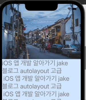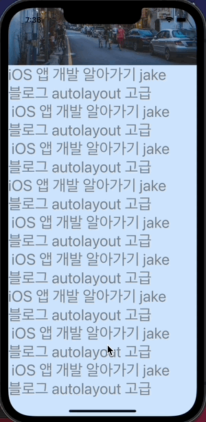 private let scrollView: UIScrollView = { let view = UIScrollView() view.contentInsetAdjustmentBehavior = .never // safe area전용 inset을 줄 것인지 view.contentInset = UIEdgeInsets(top: 0, left: 0, bottom: view.safeAreaInsets.bottom, right: 0) return view }() private let label: UILabel = { let view = UILabel() view.font = .systemFont(ofSize: 32) view.textColor = .gray view.numberOfLines = 0 view.backgroundColor = .systemBlue.withAlphaComponent(0.2) let text = "iOS 앱 개발 알아가기 jake 블로그 autolayout 고급 \n iOS 앱 개발 알아가기 jake 블로그 autolayout 고급\n iOS 앱 개발 알아가기 jake 블로그 autolayout 고급 \n" view.text = text + text + text return view }() private let imageView: UIImageView = { let view = UIImageView() view.image = UIImage(named: "sunset") view.contentMode = .scaleAspectFill return view }() - viewDidLoad() 블록 안에서 addSubview