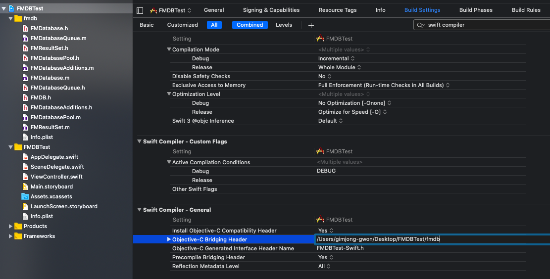 -> 브리지 헤더 파일 경로를 target, "swift compiler - General"에서 설정