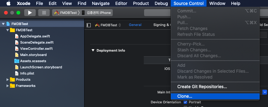 2) xcode에서 git hub주소를 이용해서 FMDB라이브러리 파일 다운