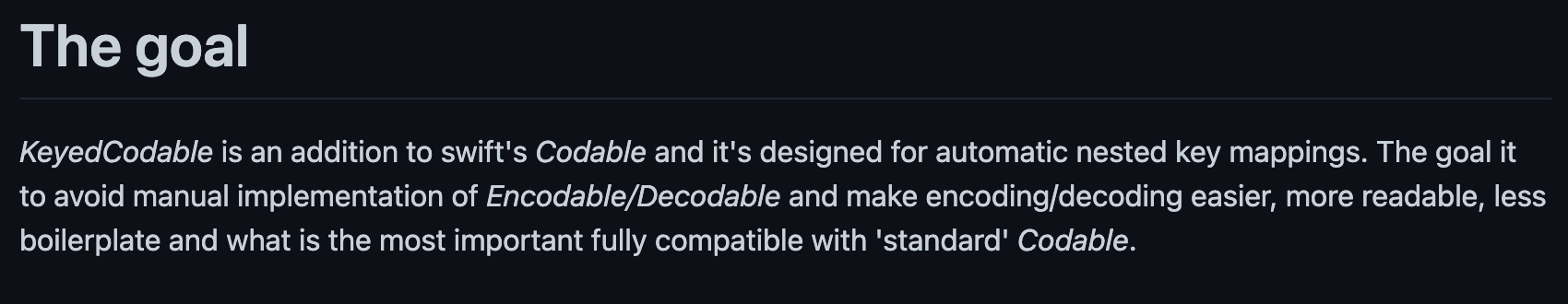import KeyedCodable /* { "user_id": "jake", "blog_info": { "name": { "first": "iOS 앱 개발 알아가기", "second": "SwiftUI 앱 개발 알아가기" } } } */ struct MyModel: Codable { enum CodingKeys: String, KeyedKey { case userID = "user_id" case blogName = "blog_info.name.first" } var userID: String? var blogName: String? } - decode, encode를 사용하는 쪽에서도 매우 편리하게 사용 가능