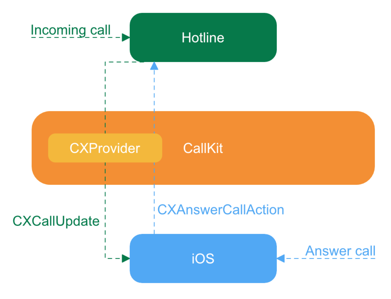 - 사용자가 호출에 응답하면 시스템이 CXAnsherCallAction 인스턴스를 CXProvider에 전달
