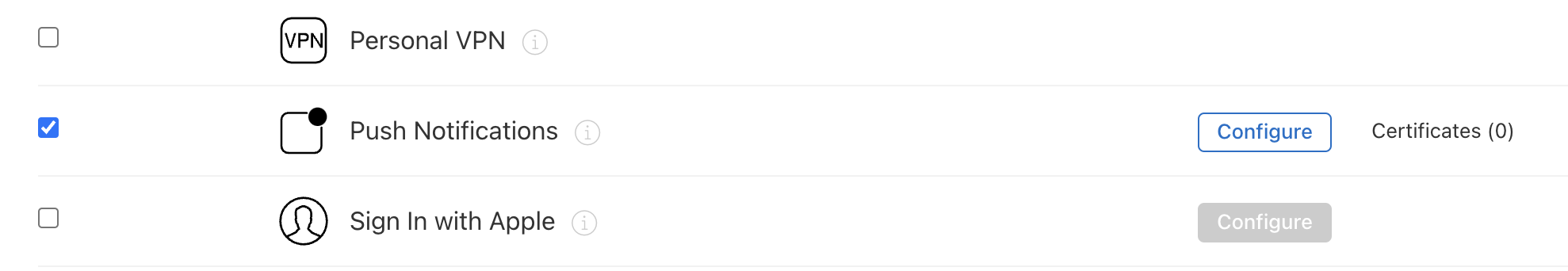 - https://developer.apple.com/certificates에서 인증서를 다운받기 전에 App Identifiers 생성: Certificates, Identifiers & Profiles -> Identifiers -> + 버튼(생성)