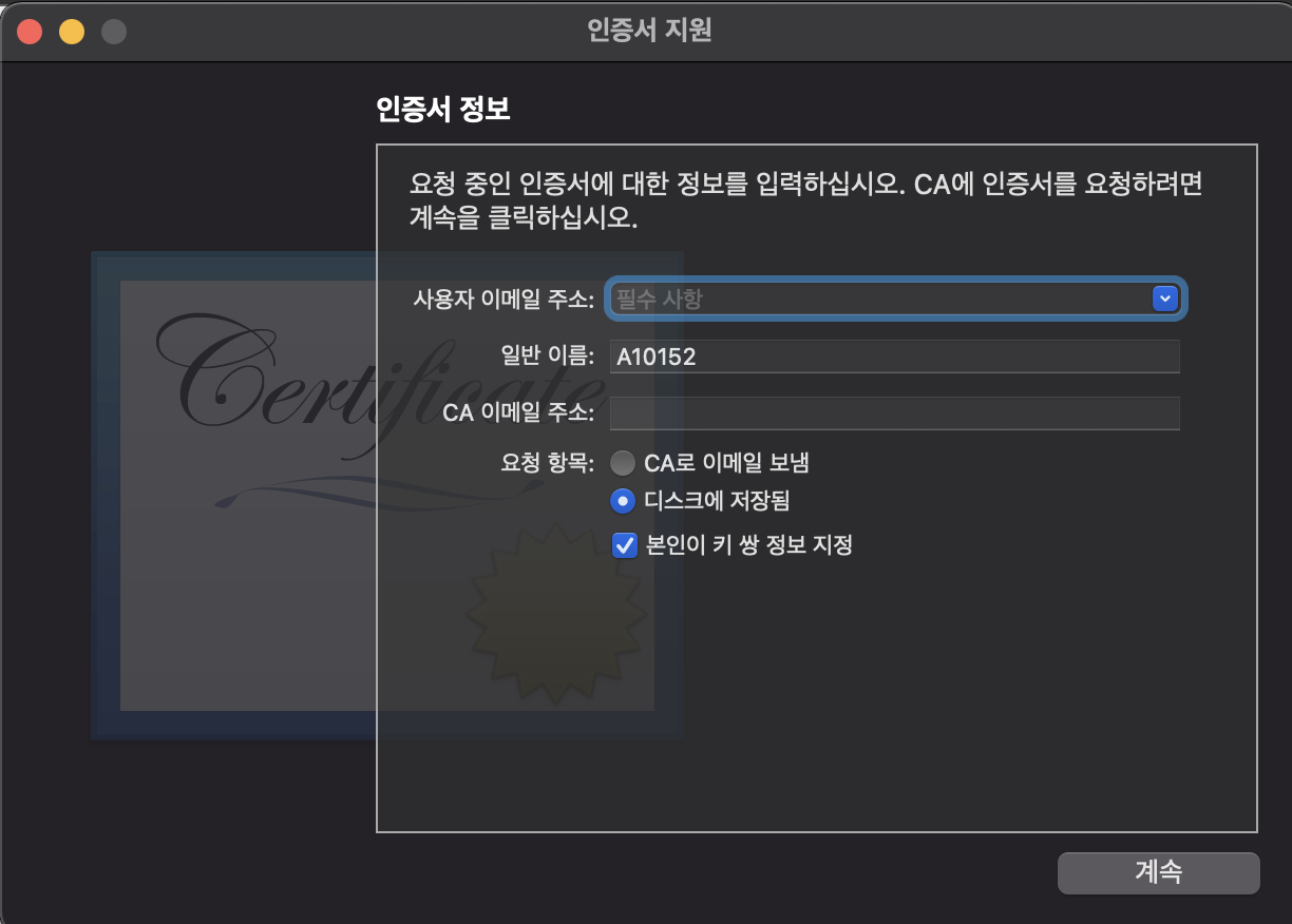- 요청항목에 "디스크에 저장됨", "본인이 키 쌍 정보 지정"에 체크 > "사용자 이메일 주소" 입력 후 계속 클릭