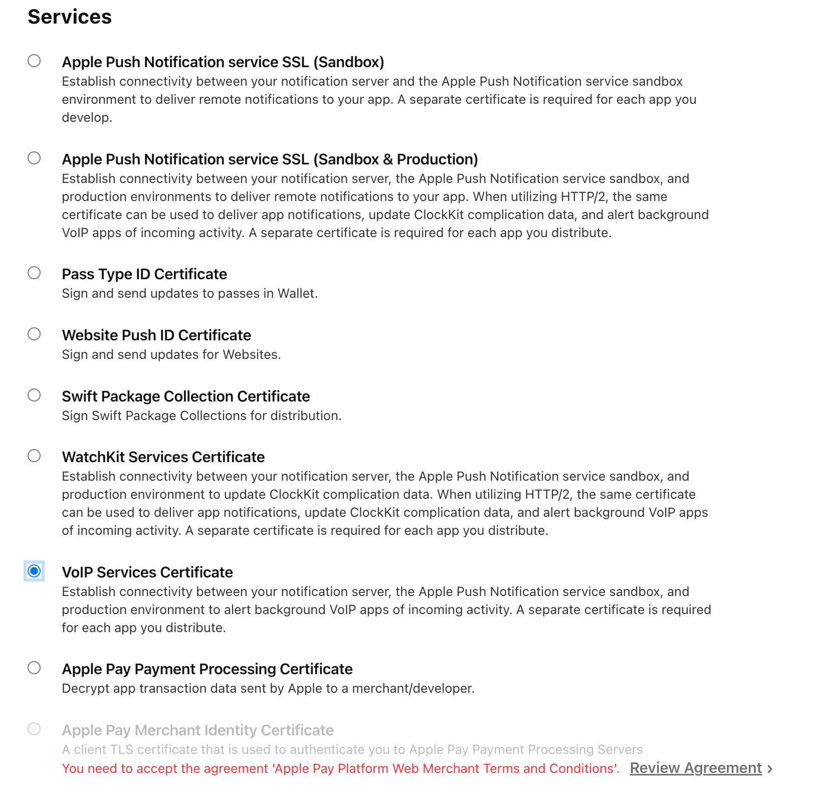 - Certificates, Identifiers & Profiles -> Certificates -> + 버튼(생성) -> 아래 옵션에서 "VoIP Services Certificate" 체크