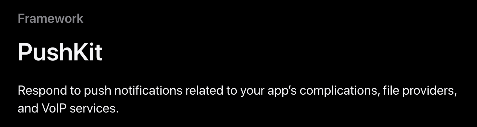 - 예시 - VoIP 앱) 앱이 종료된 상태에서 VoIP 호출이 수신될 때 앱을 깨우고 싶은 경우, APN으로만 하면 푸시 알림이 앱을 바로 깨우지 않기 때문에 PushKit사용
