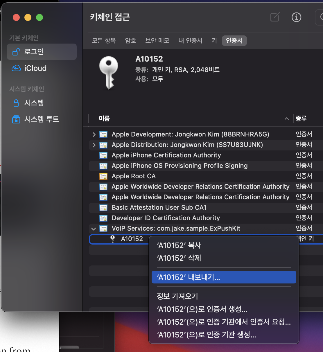 - Keychan Access 앱 실행 -> 인증서 -> 다운받은 인증서 VoIP Services를 드래그하여 이동