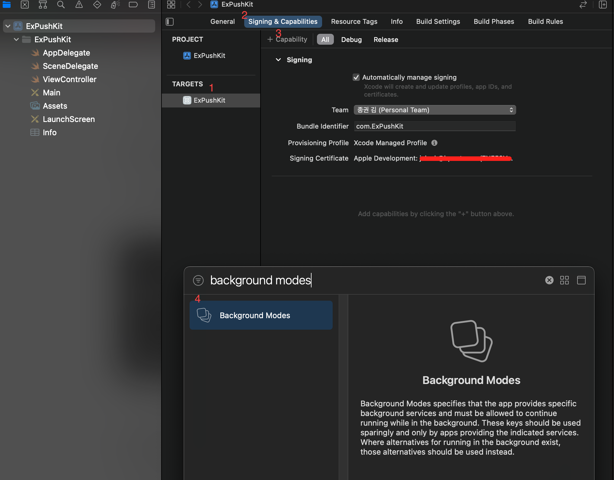 - Target -> Signing & Capabilities -> +Capability: push notification 추가