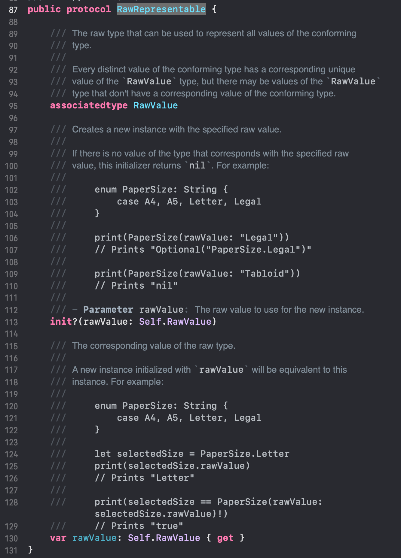 - swift에서의 enum은 하나 이상의 `associated value`를 갖을 수 있는데, 이 값의 rawValue에 대한 정의하는 프로토콜