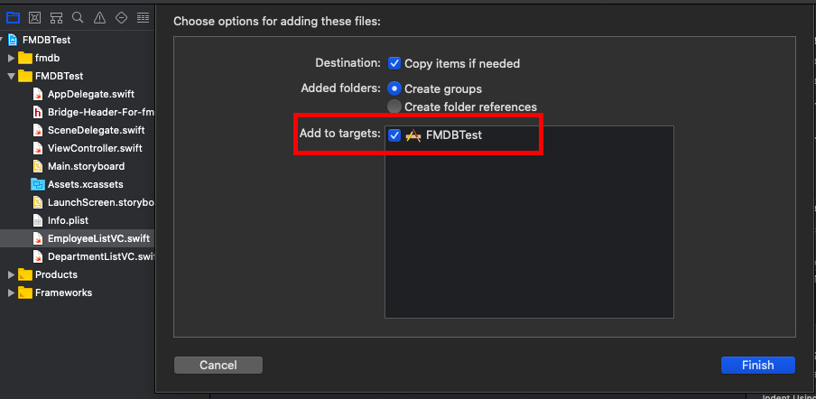 3. 위에서 만든 템플릿 DB를 xcode프로젝트에 드래그&드롭
