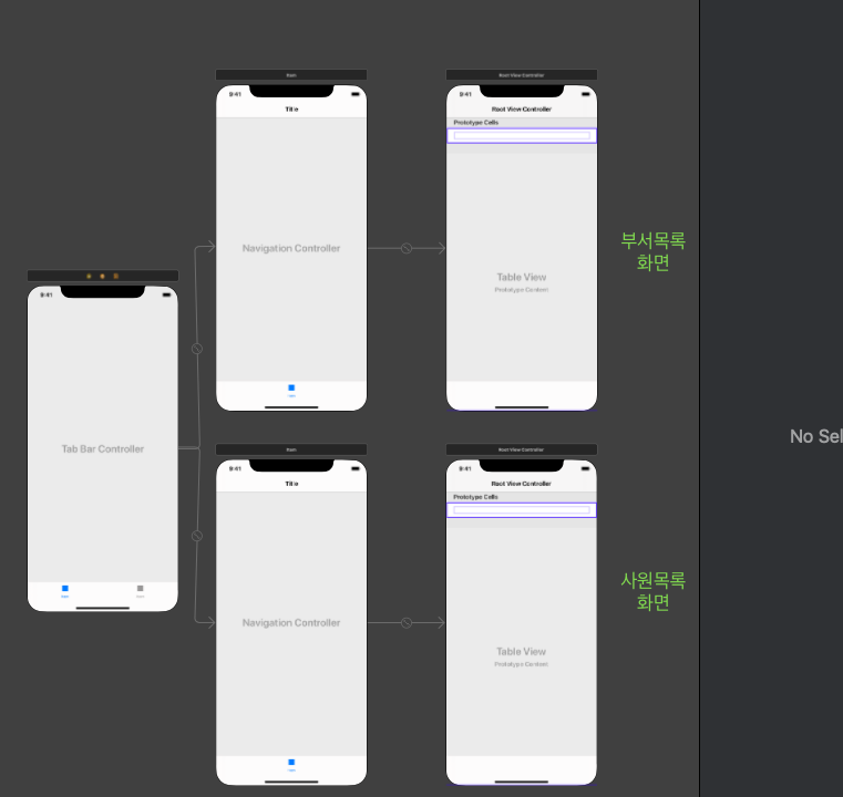 1. 스토리보드 세팅 (각 뷰컨트롤러 클래스 생성 및 연결할 것, DepartmentListVC.swift, EmployeeListVC.swift)