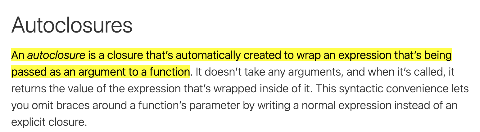 정리) 인수로 closure를 넘겨야 할 때, 함수를 넘기는 경우 (== 클로저 부분의 코드가 한 줄인 경우), autoclosure를 사용하면 가독성 향상되므로 함수를 넘기는 경우에 autoclosure 사용
