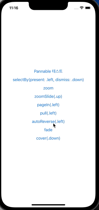- present와 dismiss 방향 설정이 자유롭게 가능 (아래 예제 - left present와 down dismiss 적용