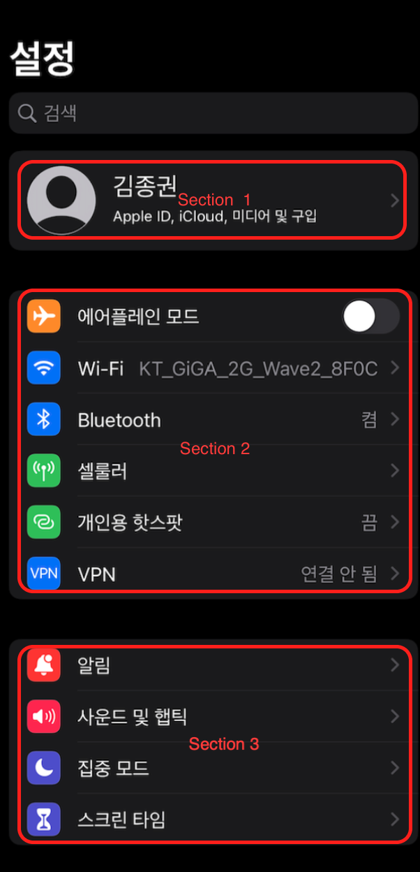 - 아래처럼 아이폰에 설치되어 있는 Setting앱을 보면, 하나의 TableView안에 Section이 여러개로 나누어져 있는 패턴
