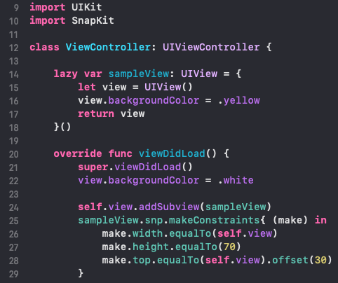 - UIView객체.snp.makeContraints( 트레일링클로저 )로 접근, 25번~29번라인