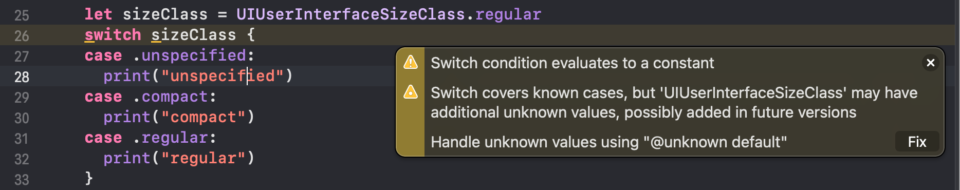 - Objective-C의 UIUserInterfaceSizeClass을 사용할 때 case에 모든 유형을 명시했지만 warning 메시지가 표출