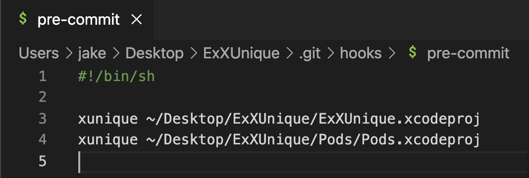 { echo '#!/bin/sh'; echo 'xunique ./ExXUnique.xcodeproj'; echo 'xunique ./Pods/Pods.xcodeproj'; } > .git/hooks/pre-commit