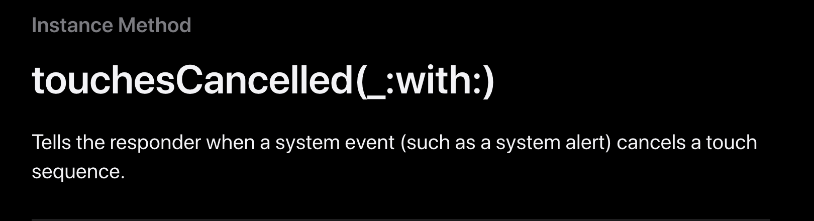 - touchesCancelled: 위 3가지 이벤트가 발생도중에 system alert와 같은게 발생한 경우, touchesCanclled 발생