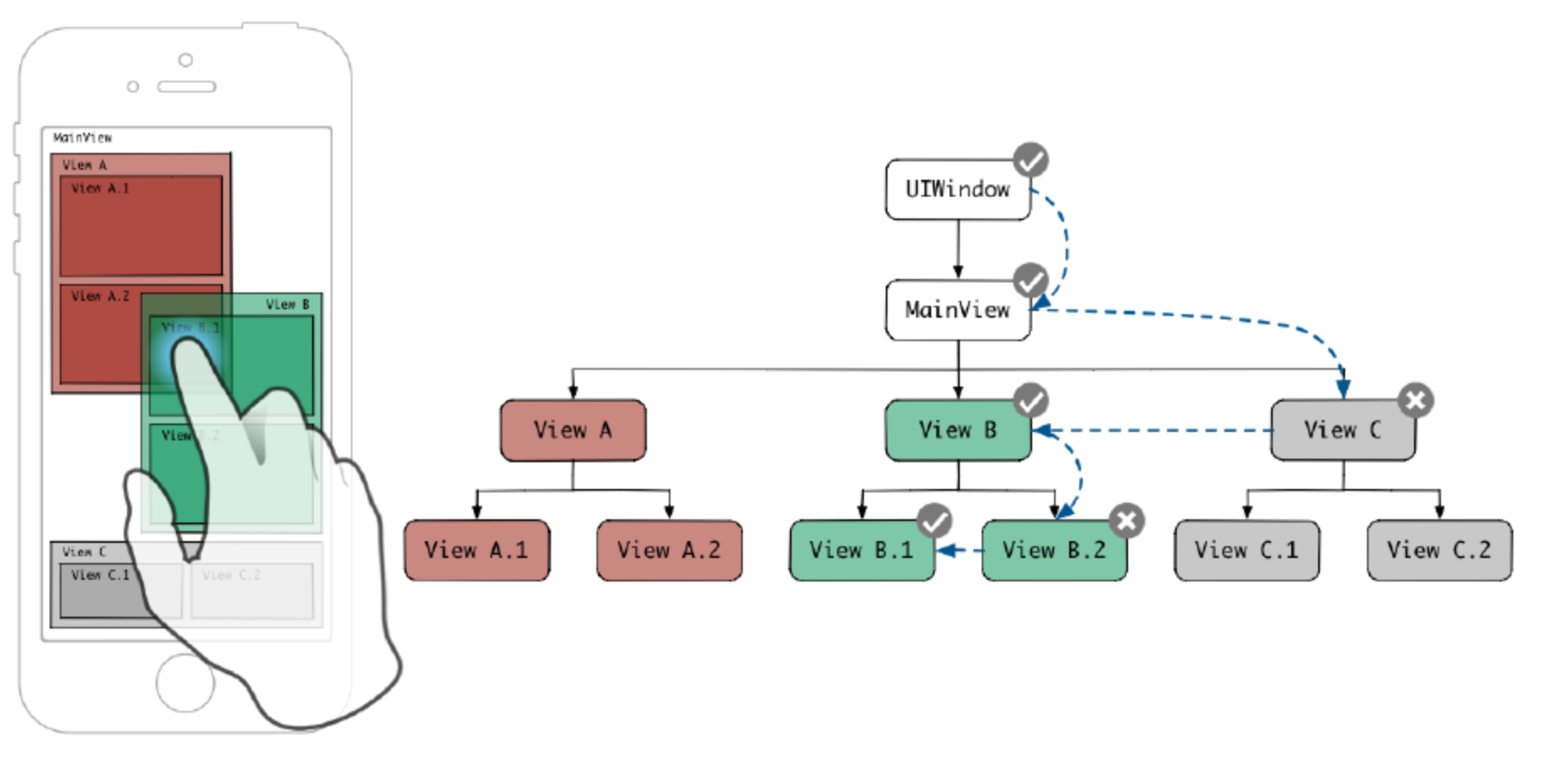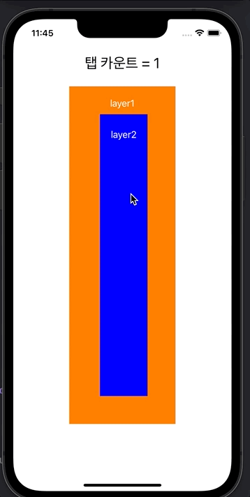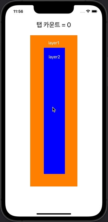 - Responder chain의 기본 원리는 superview부터 체크하기 때문에, layer2가 탭되어도 흰색 view의 탭 이벤트가 발생하는 것