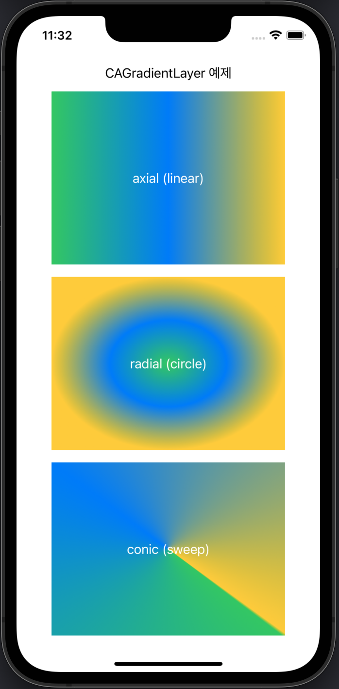 [iOS - swift] CAGradientLayer, Gradation의 종류, axial, radial, conic (linear, circle, sweep) 본문