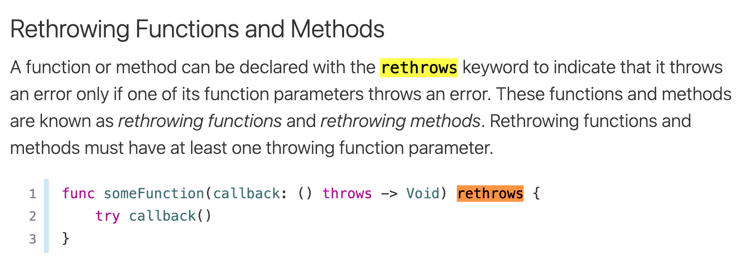 - 이름이 rethrows인 이유: argument 내부에서 에러가 발생하면, 다시 외부러 throws를 던져서 외부에서 처리하게끔하기 위한 방법