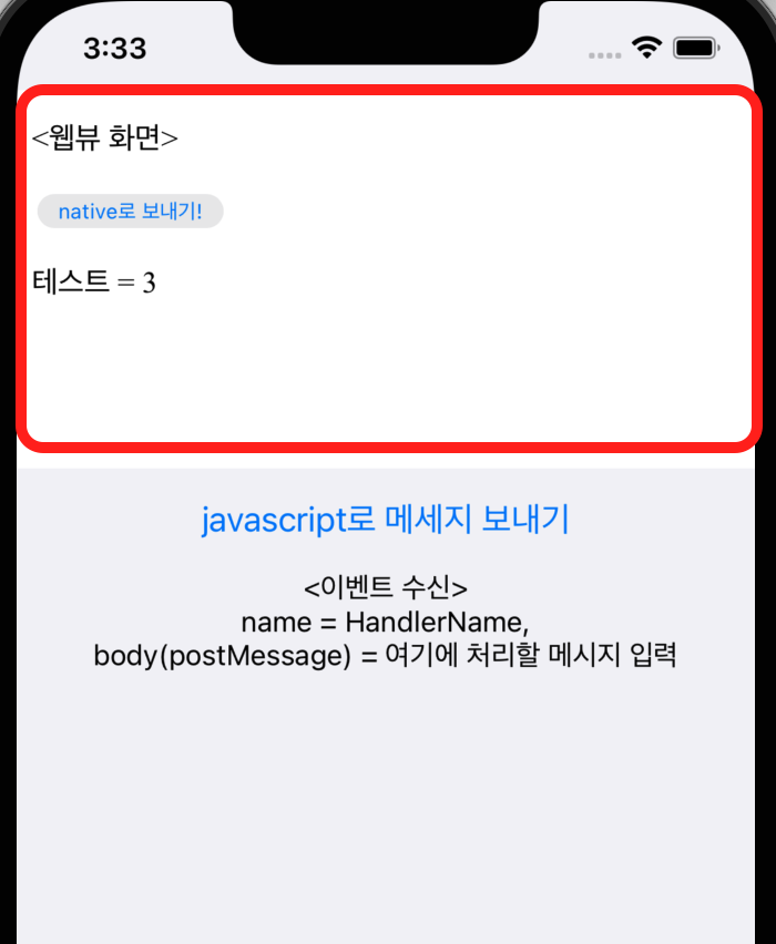 - 하단에 webView로 메시지를 보내는 버튼, 이벤트를 수신한 경우 메시지를 띄워줄 label 준비