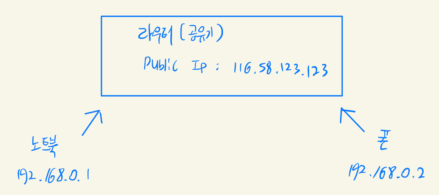 - 공유기는 public IP를 가지고, 노트북과 폰은 private IP를 가지고 있는 형태