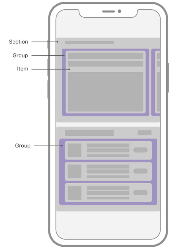 - 레이아웃을 구성할 때 section, group, item의 레이아웃을 설정하여 구현