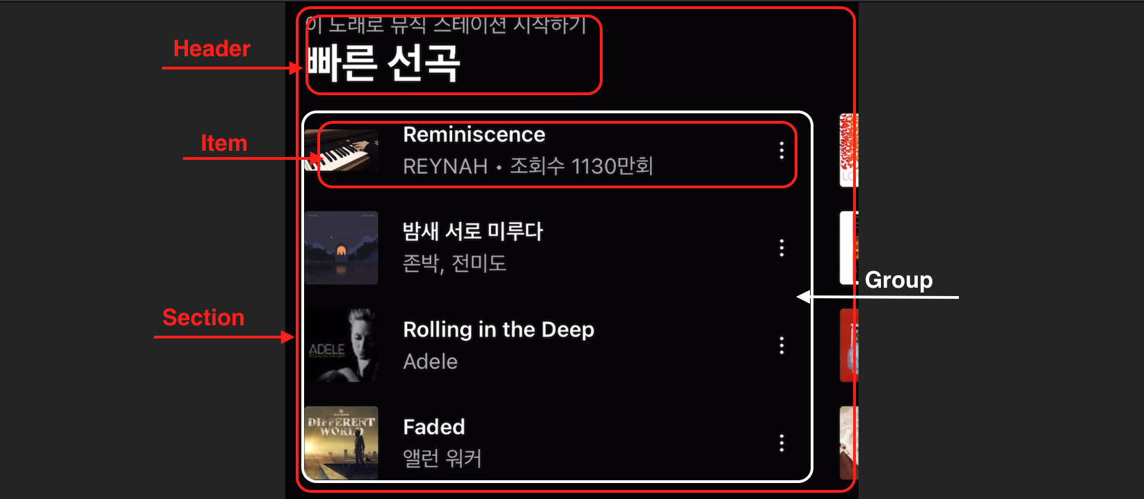- group부분: item이 2개 보이고 3개는 오른쪽에 걸쳐서, 수평 스크롤을 암시해주는 UI