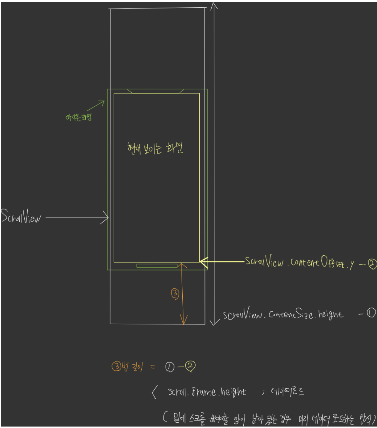 - 1번 방법) 스크롤된 위치를 계산하여, 남은 아래 영역이 프레임의 크기보다 작게 남은 경우, 페이지네이션 실행
