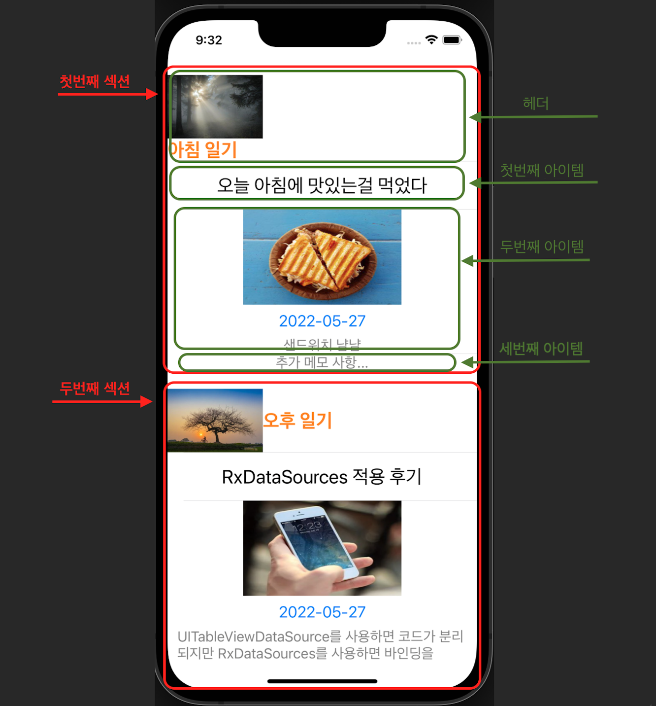 - RxDataSources에서는 model이라는 이름을 쓰는데, 이 model이 section과 동일하다고 기억할것
